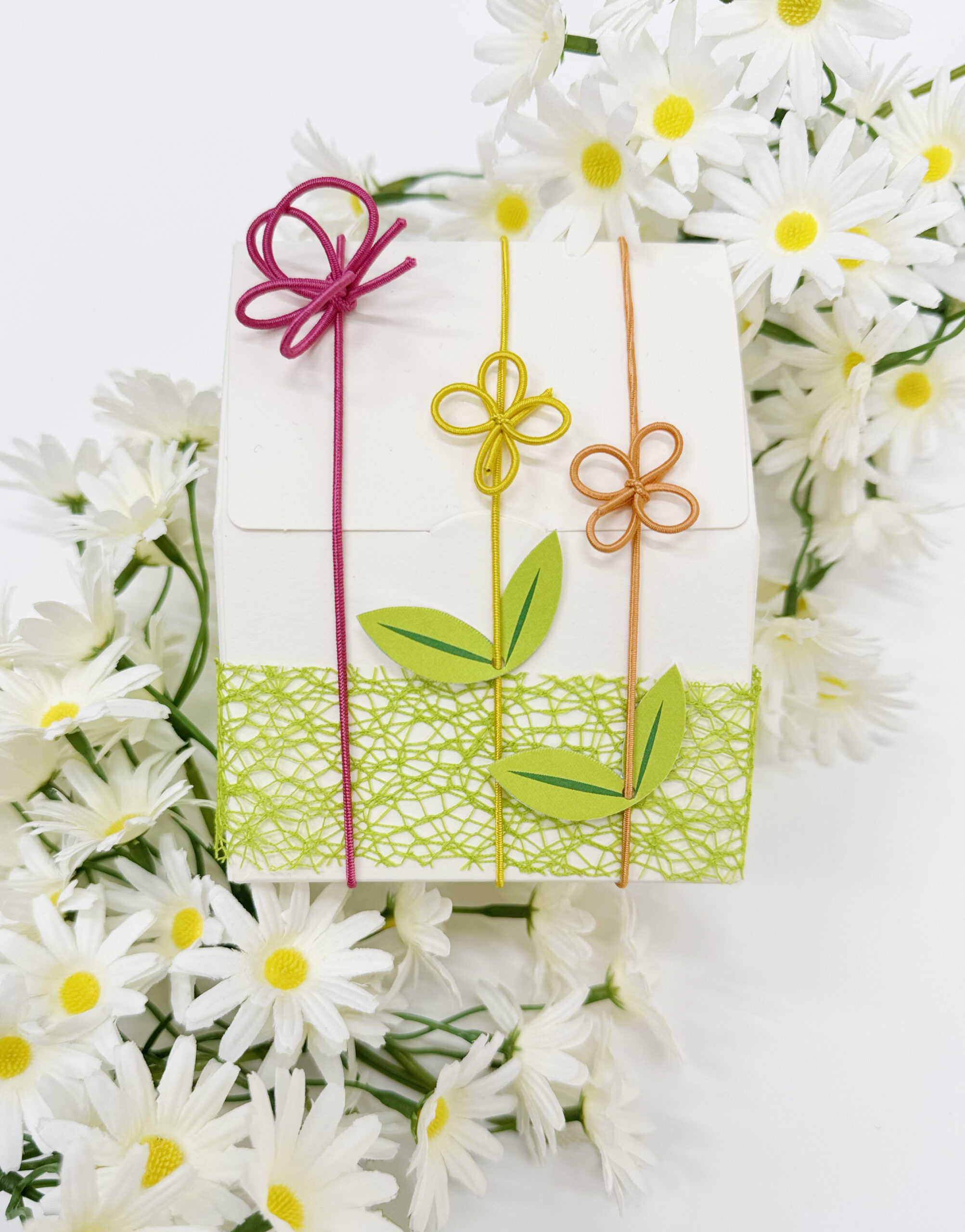 リボンワークは、一般的なゴムをお花や葉っぱのかたちに結び、そのまま箱に掛けられるデザインを提案しています。特別な箱でなくても、ひとさじのセンスを加えるだけでギフト全体がいきいきと感じられる。そんな瞬間を生み出すためのさりげない工夫を重ねています。